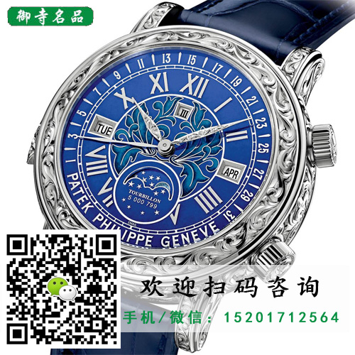 自动上链机芯,18K白金,外圈镶钻石,蓝色表盘配备日历、 星体移动苍穹图、月相与月行轨迹及星体移动显示,透视底盖, 原装鳄鱼皮表带,原装18K 白金镶钻卡拉卓华折叠扣,年份约 2012 年 表径:44mm 附件:原装表盒及证书